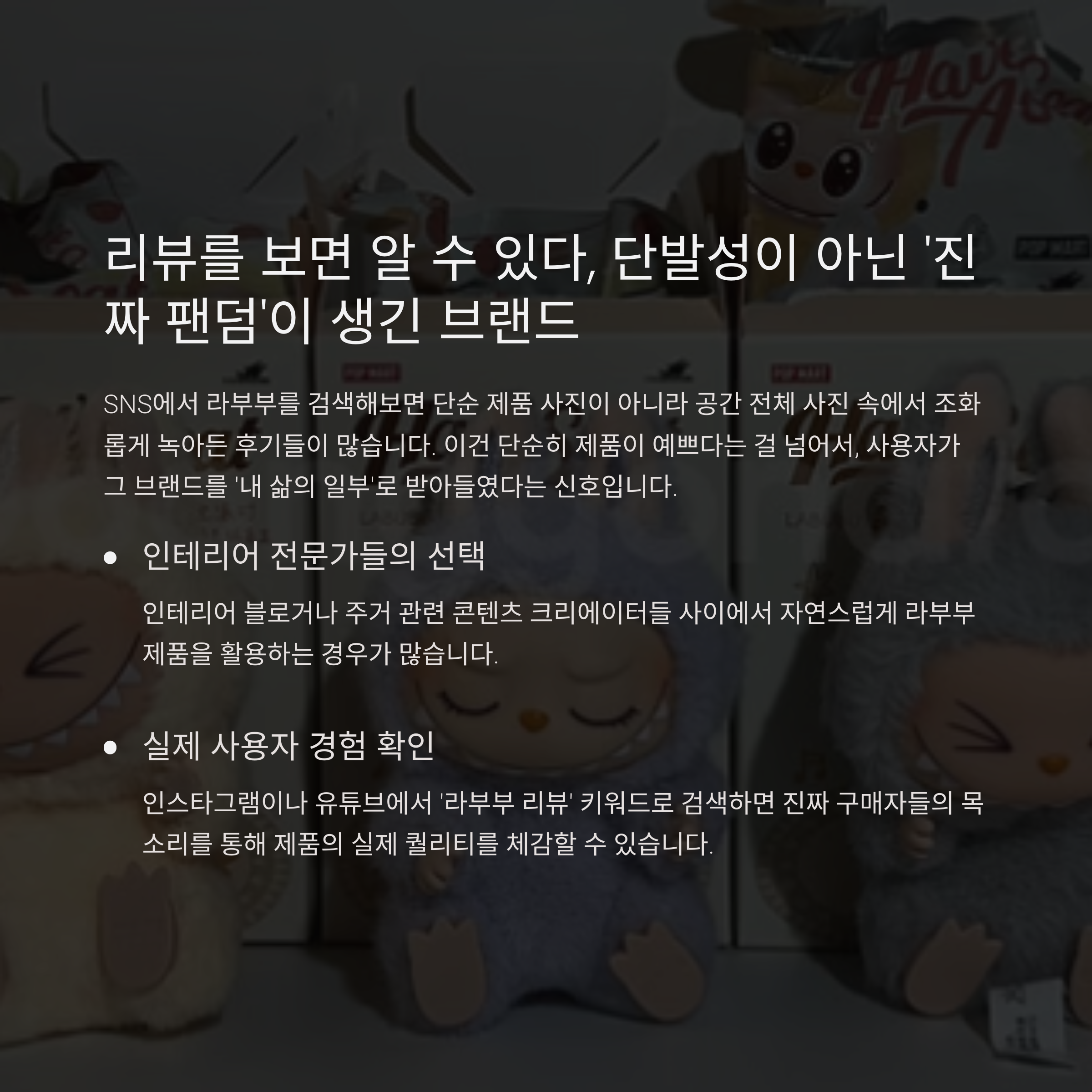 SNS에서 라부부를 검색해보면 단순 제품 사진이 아니라 공간 전체 사진 속에서 조화롭게 녹아든 후기들이 많습니다. 이건 단순히 제품이 예쁘다는 걸 넘어서, 사용자가 그 브랜드를 ‘내 삶의 일부’로 받아들였다는 신호입니다.