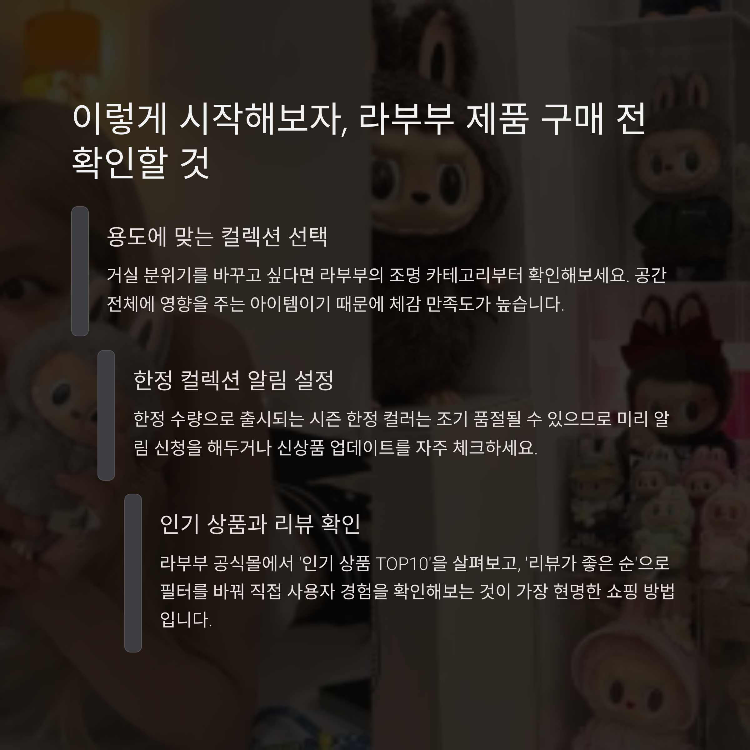지금 바로 라부부 제품 중 한 가지를 장바구니에 담아보세요. 시작이 어렵지 않다는 것을, 그리고 하나를 들이면 왜 자꾸 더 사고 싶어지는지를 직접 체험하게 될 것입니다.