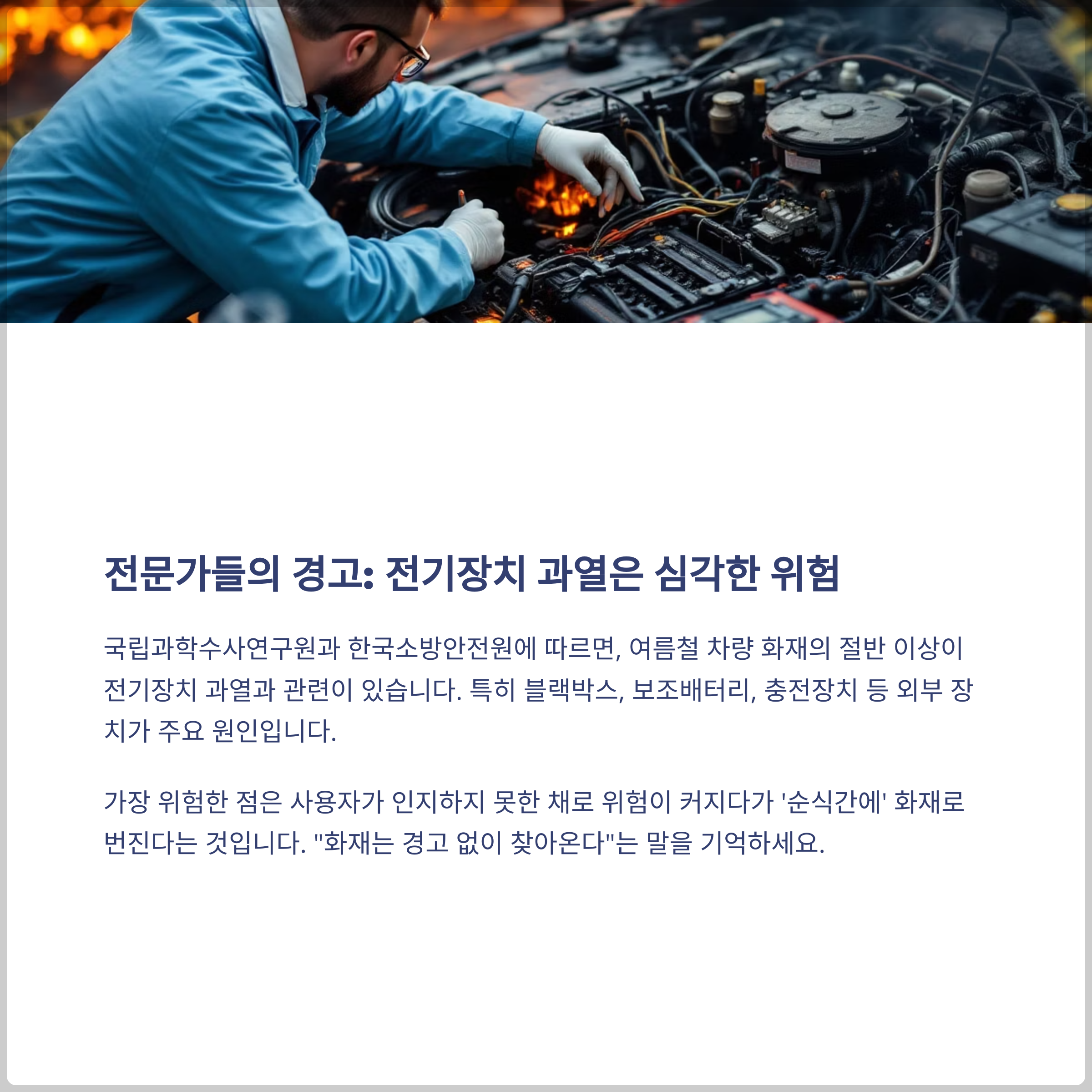 국립과학수사연구원과 한국소방안전원의 발표 자료에 따르면, 여름철 차량 화재 중 절반 이상은 전기장치 과열과 연관이 있으며 특히 블랙박스와 보조배터리, 충전장치 등 외부 장치가 원인이 되는 경우가 많다고 지적했습니다. 문제는 사용자가 인지하지 못한 채로 위험이 커지다 ‘순식간에’ 화재로 번진다는 점입니다. "화재는 경고 없이 찾아온다"는 말을 기억하십시오. 차량에 탑재된 전자기기와 전기장치가 얼마나 위험할 수 있는지 지금부터라도 경각심을 가지는 것이 필요합니다.