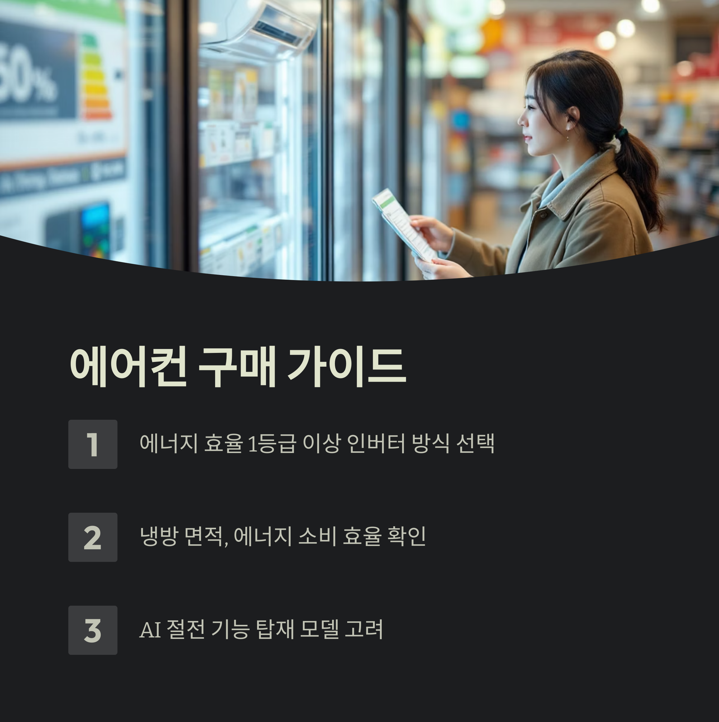 구매 시 확인할 점은 냉방 면적, 에너지 소비 효율, 절전 기능 탑재 여부입니다.