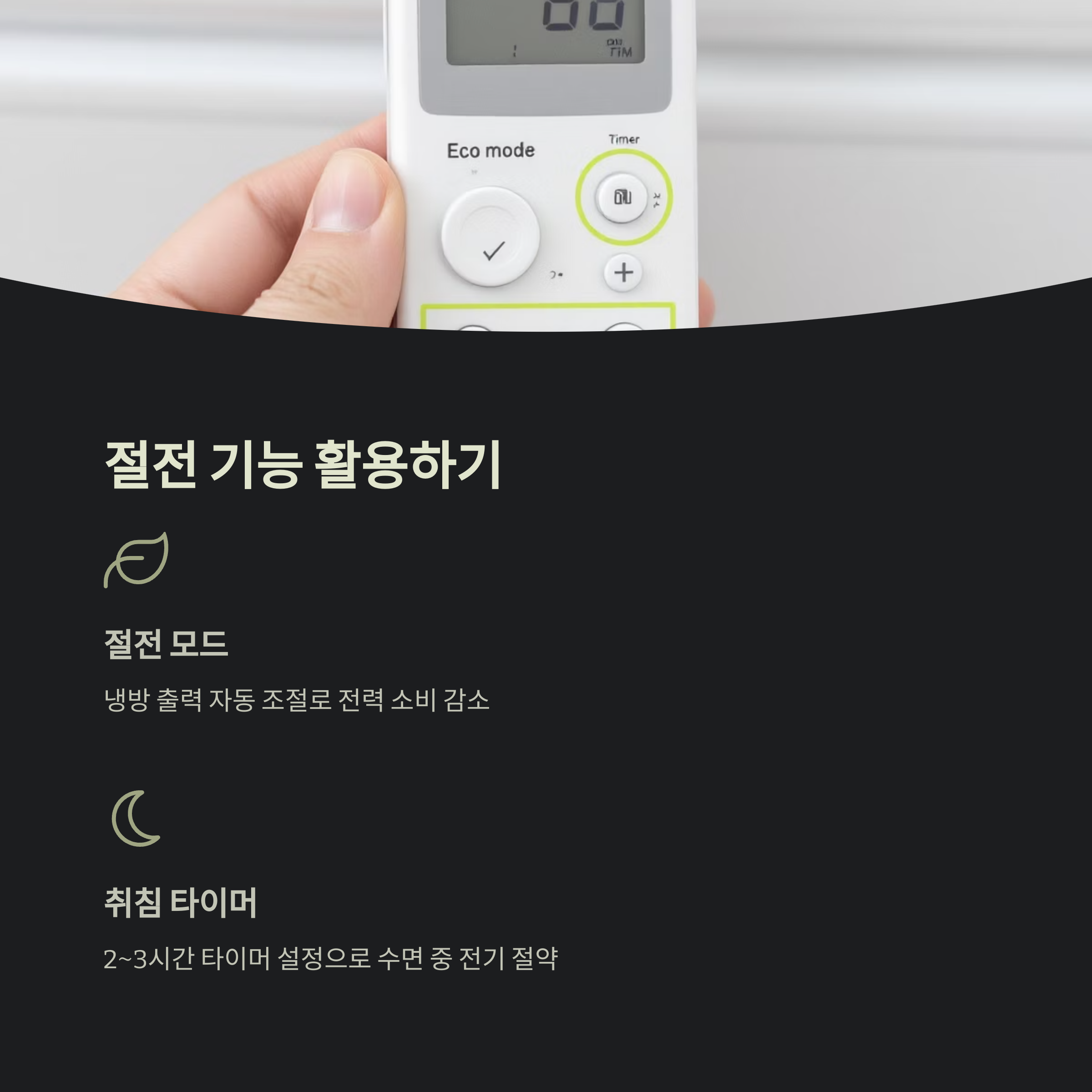 - 절전 모드와 타이머 기능을 병행해 수면 중 냉방도 절약