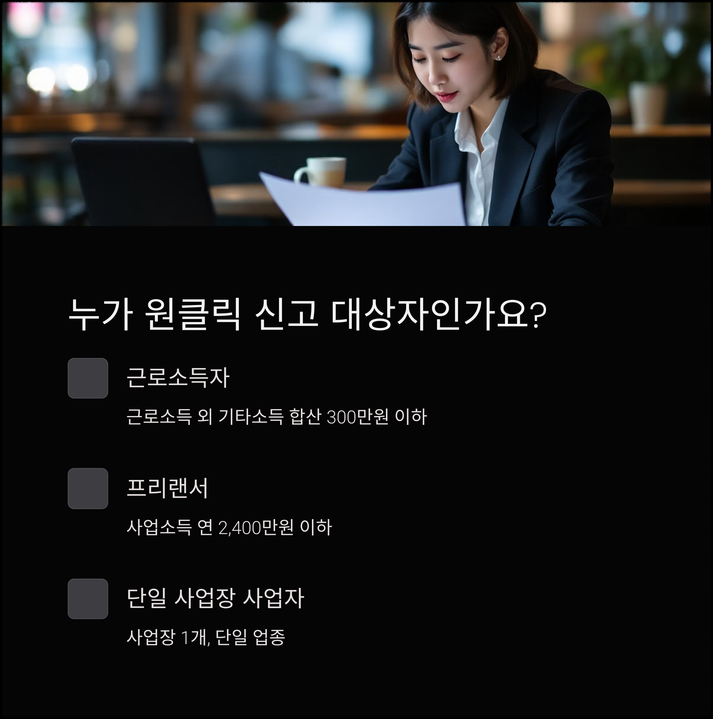 | 프리랜서(기타소득자) | 사업소득 연 2,400만원 이하 | 원클릭 신고 가능 |