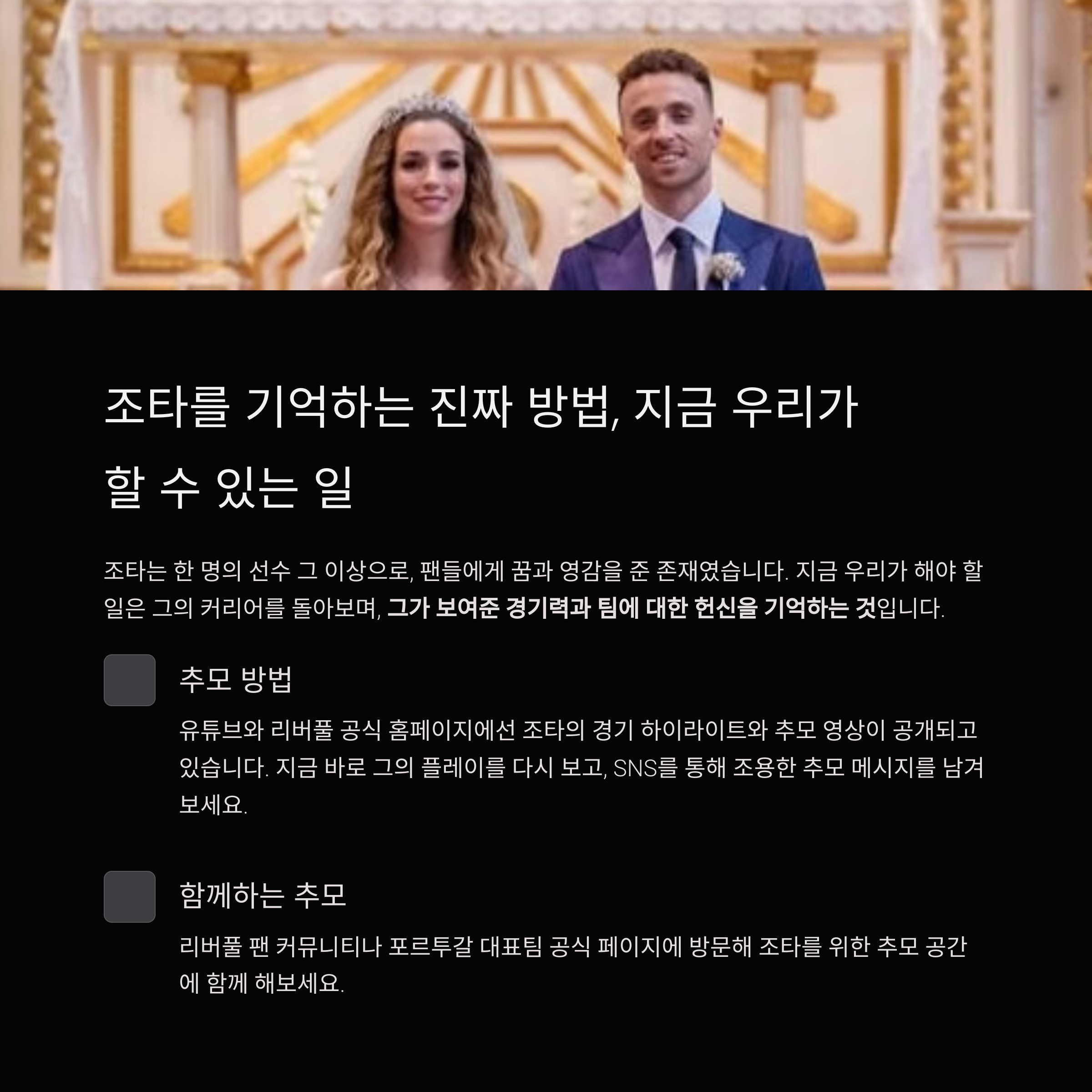 그리고 이 글을 본 지금, 리버풀 팬 커뮤니티나 포르투갈 대표팀 공식 페이지에 방문해 조타를 위한 추모 공간에 함께 해보세요.