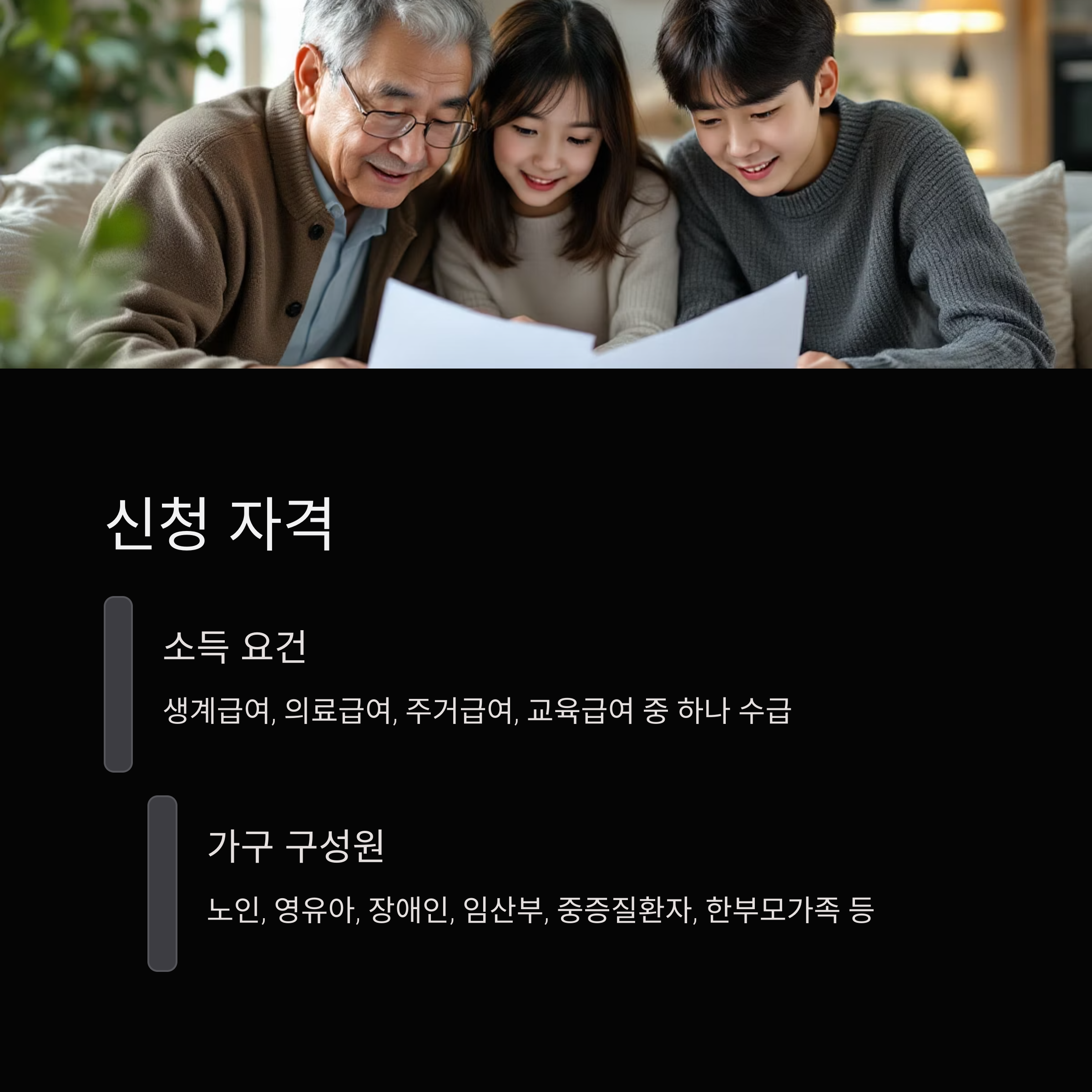 첫째, 소득요건입니다. 국민기초생활 보장법에 따라 생계급여, 의료급여, 주거급여, 교육급여 중 하나를 수급 받고 있어야 합니다.