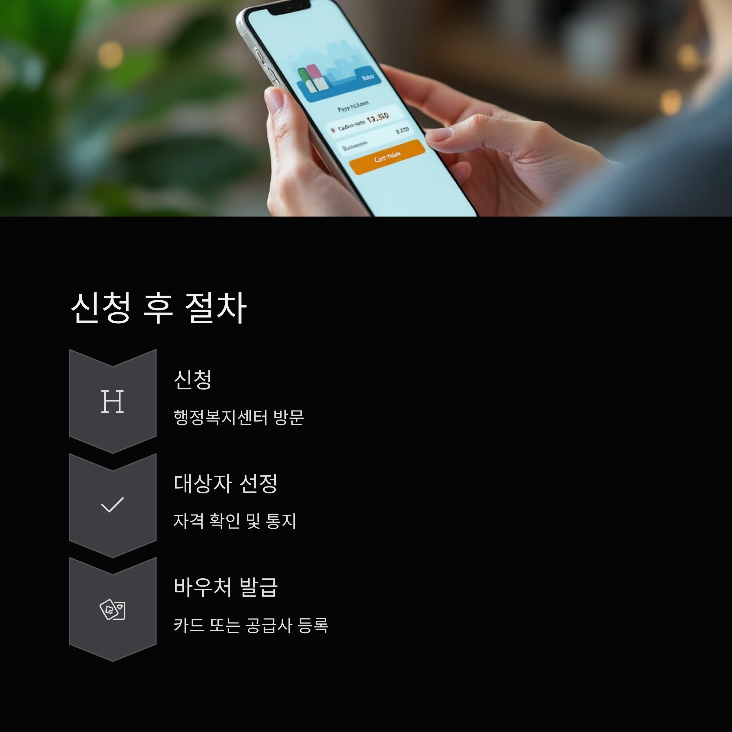 신청 → 읍면동에서 대상자 선정 및 결정 통지 → 바우처 발급(카드, 공급사 등록) → 사용 및 정산 모니터링