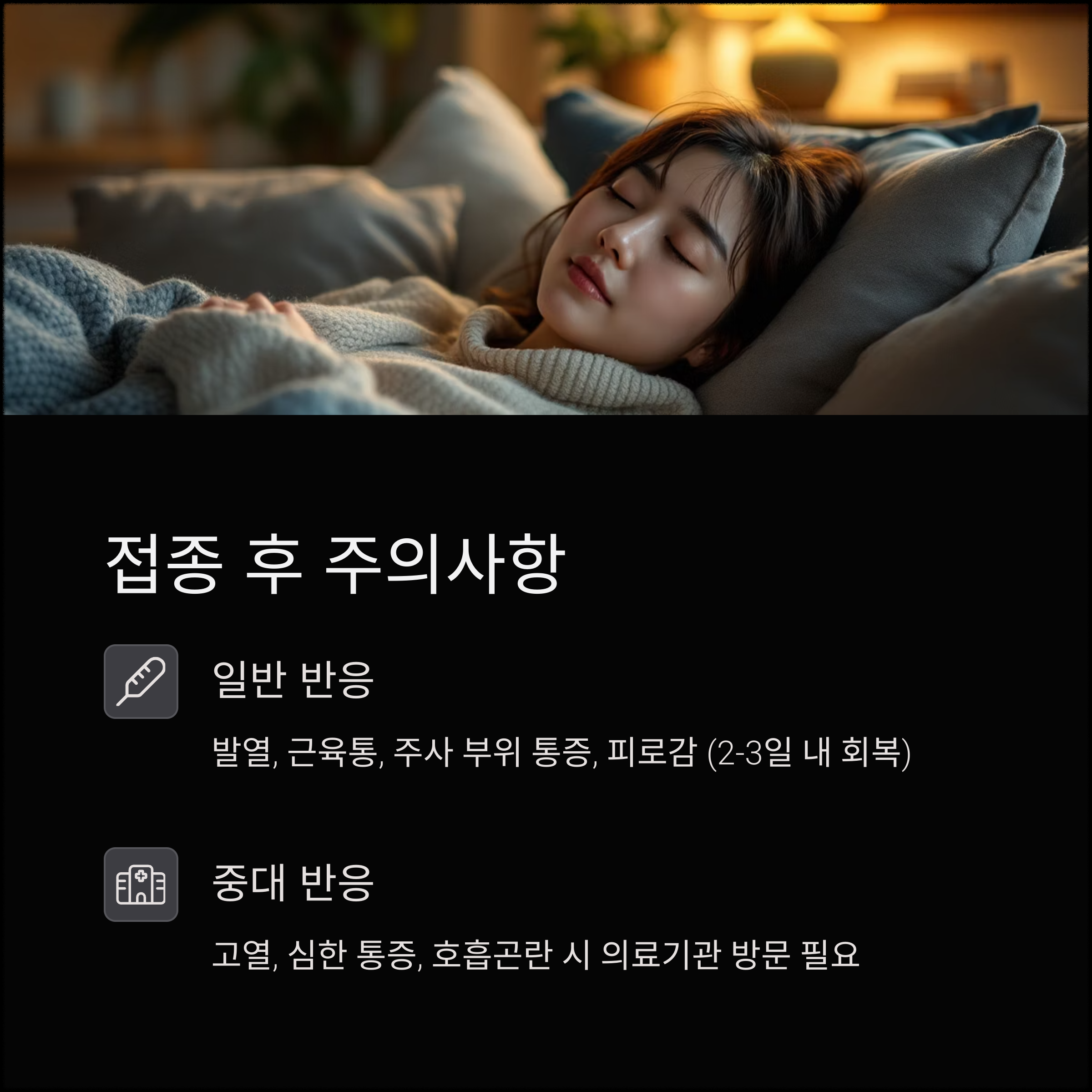 고열이나 심한 통증, 호흡곤란 등 중대한 이상 반응 발생 시에는 반드시 의료기관을 방문해야 합니다.