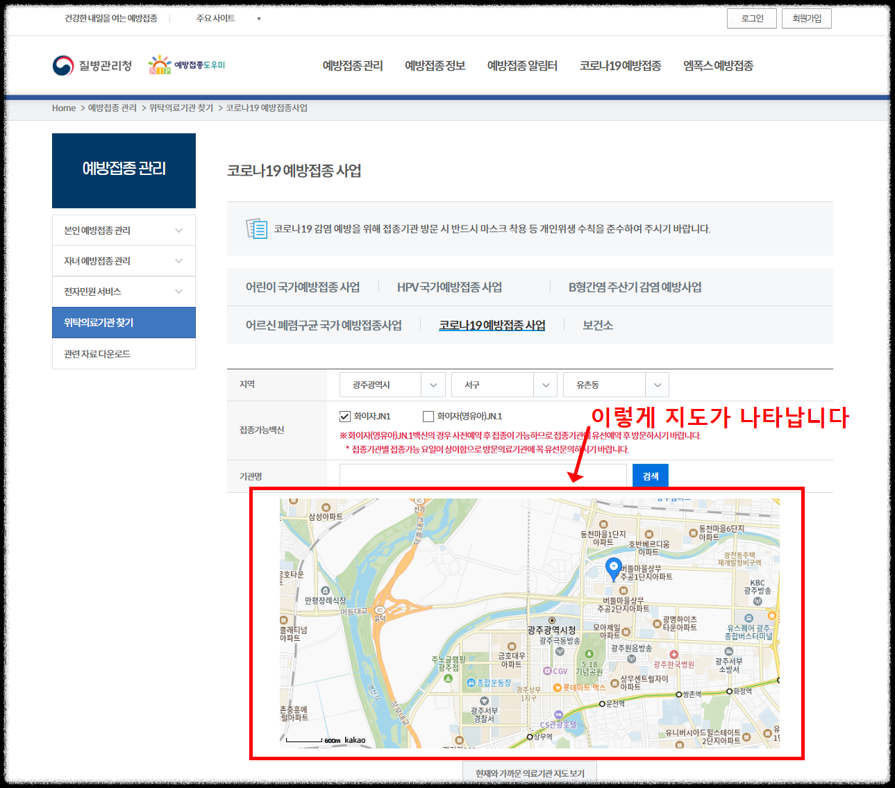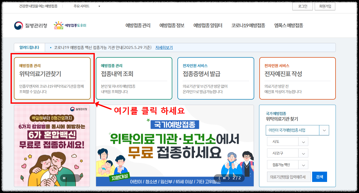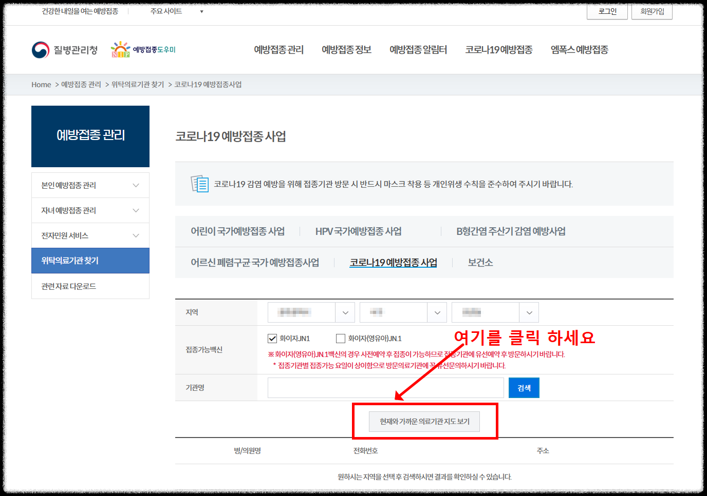 질병관리청 홈페이지에서 위탁의료기관 찾기를 클릭하세요