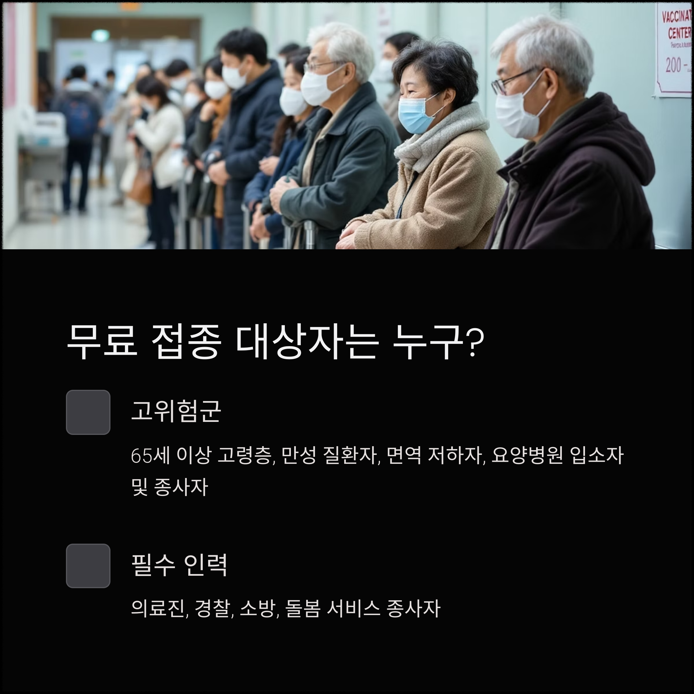 또한, 의료진과 사회 필수 인력(경찰, 소방, 돌봄 서비스 종사자) 역시 무료 접종 대상에 포함됩니다.