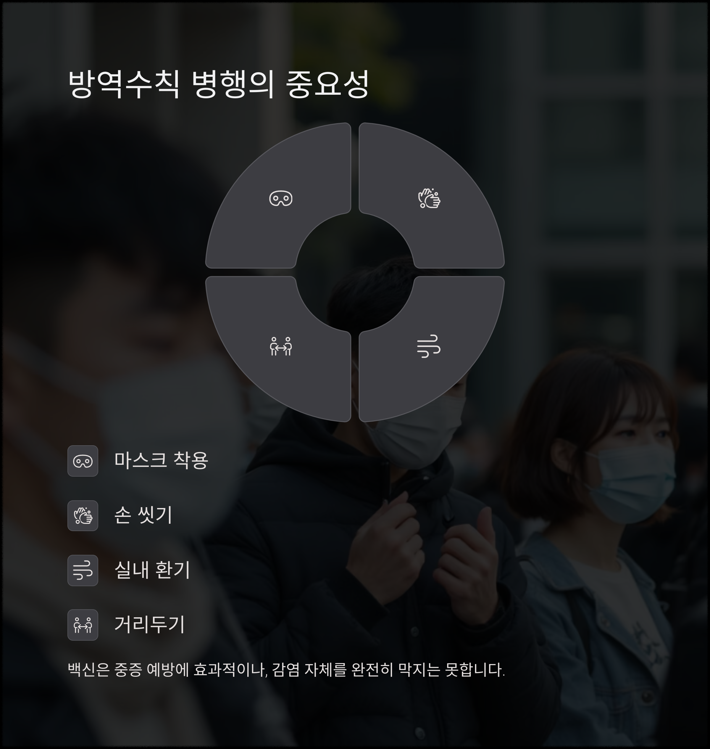 따라서 예방접종과 일상 속 방역 수칙은 서로 보완적으로 이루어져야 합니다.
