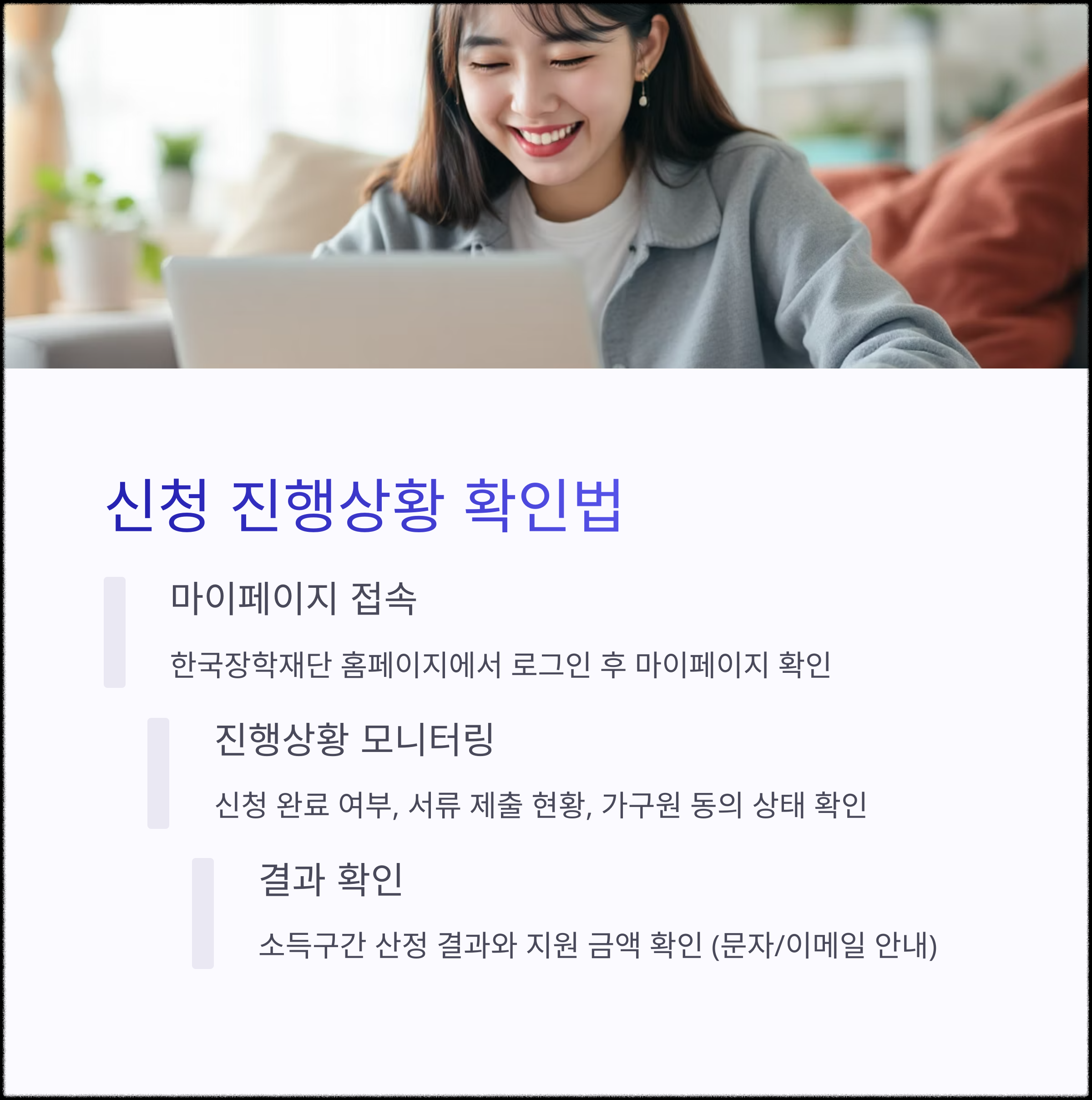 신청을 완료한 후에는 한국장학재단 홈페이지의 마이페이지를 통해 전체적인 진행 상황을 모니터링할 수 있습니다. 이곳에서는 신청 완료 여부, 제출해야 할 서류 목록과 제출 현황, 가구원 동의 진행 상태 등을 실시간으로 확인할 수 있습니다.