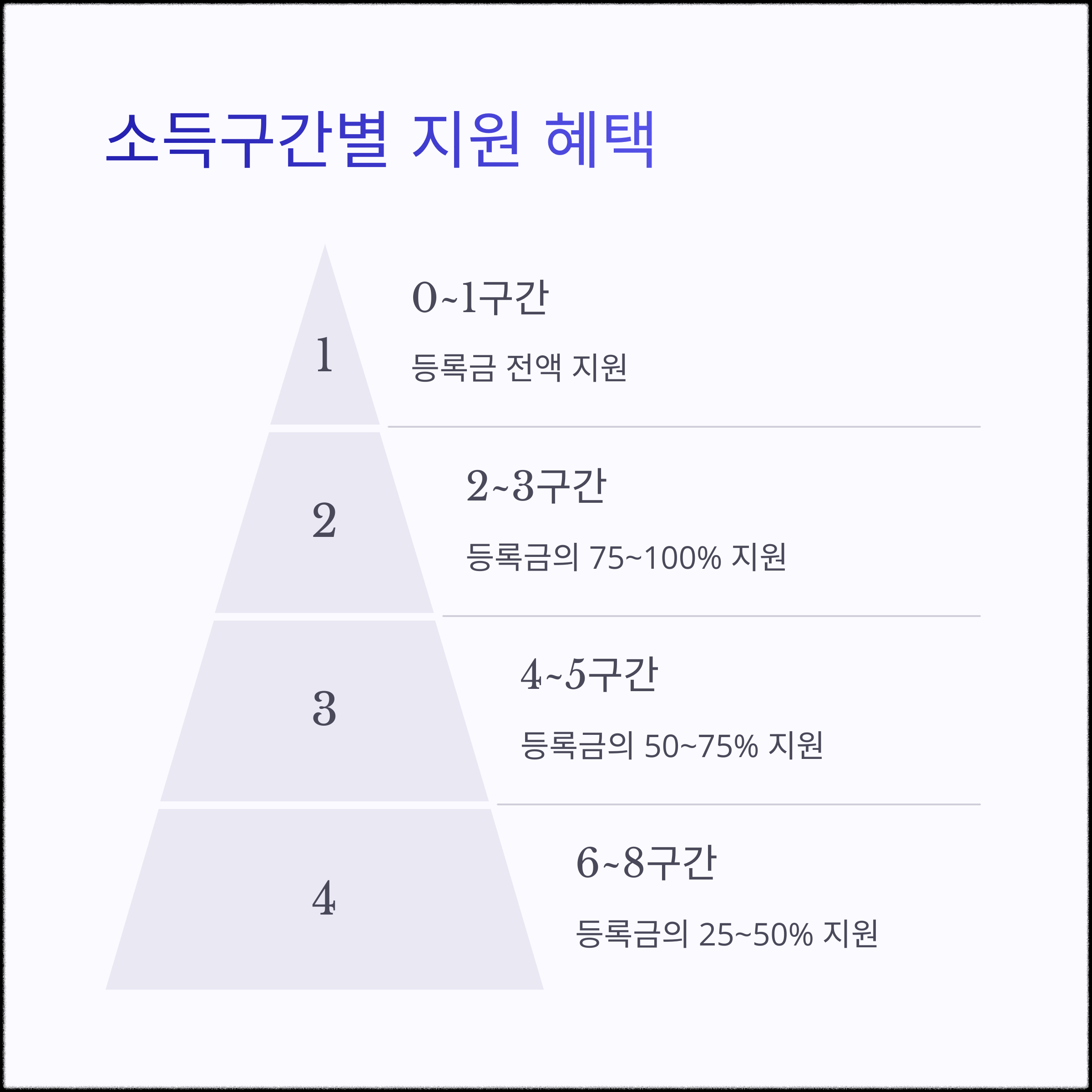 소득 0구간부터 1구간에 해당하는 가정의 학생들은 등록금 전액 지원을 받을 수 있습니다. 2구간과 3구간은 등록금의 75퍼센트에서 100퍼센트까지 지원받으며, 4구간부터 5구간은 등록금의 절반에서 75퍼센트 정도 지원됩니다. 6구간부터 8구간까지는 등록금의 25퍼센트에서 50퍼센트 정도가 지원되며, 9구간 이상은 국가장학금 지원 대상에서 제외됩니다.