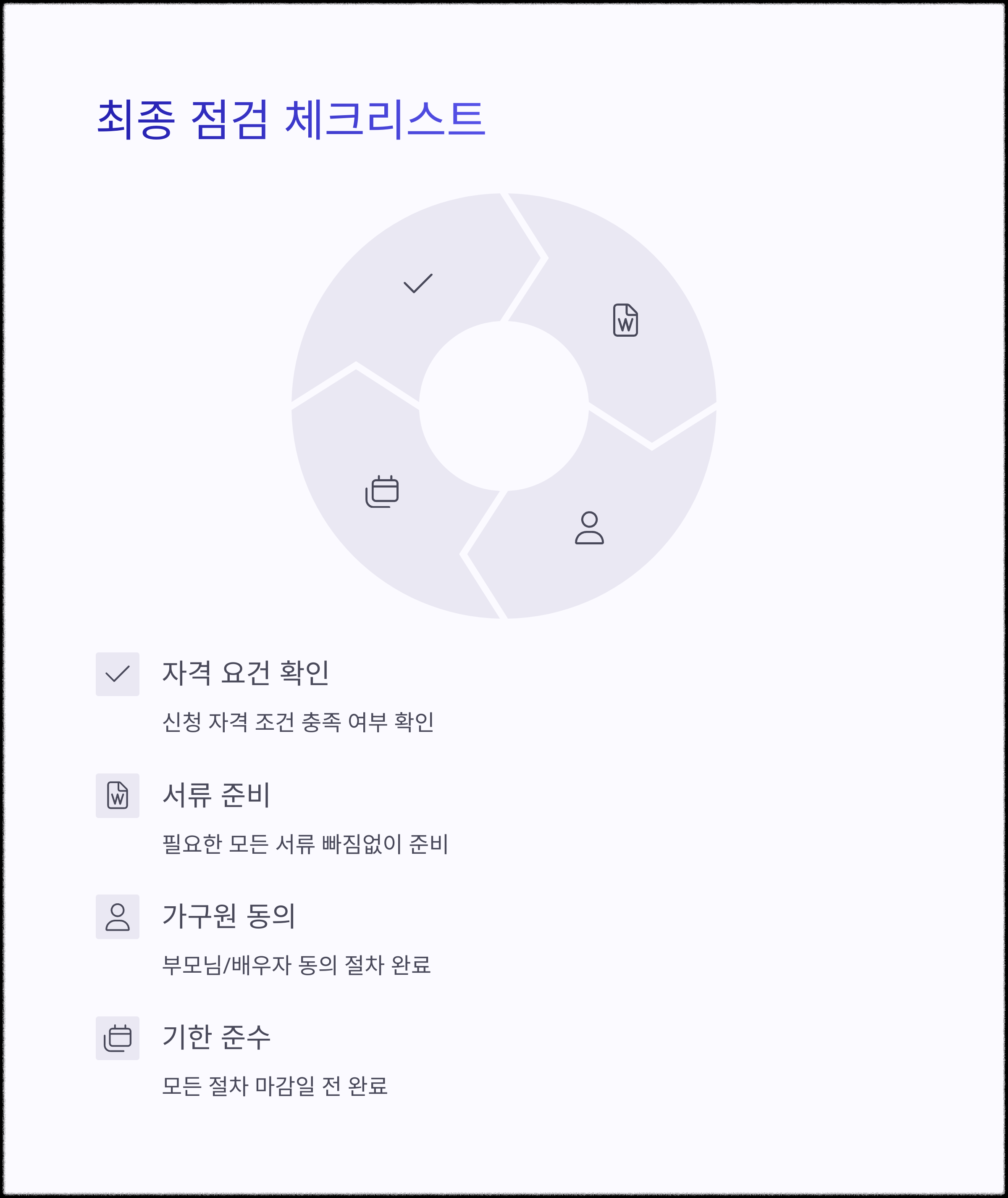 그 밖에 신청자의 특수한 상황에 따라 추가 서류가 요구될 수 있습니다. 예를 들어 부모의 이혼, 사망, 실종 등의 상황이나 특별한 가족 관계가 있는 경우 관련 증빙 서류가 필요할 수 있습니다. 이런 서류들은 요청받은 경우 반드시 지정된 기한 내에 제출해야 합니다.
