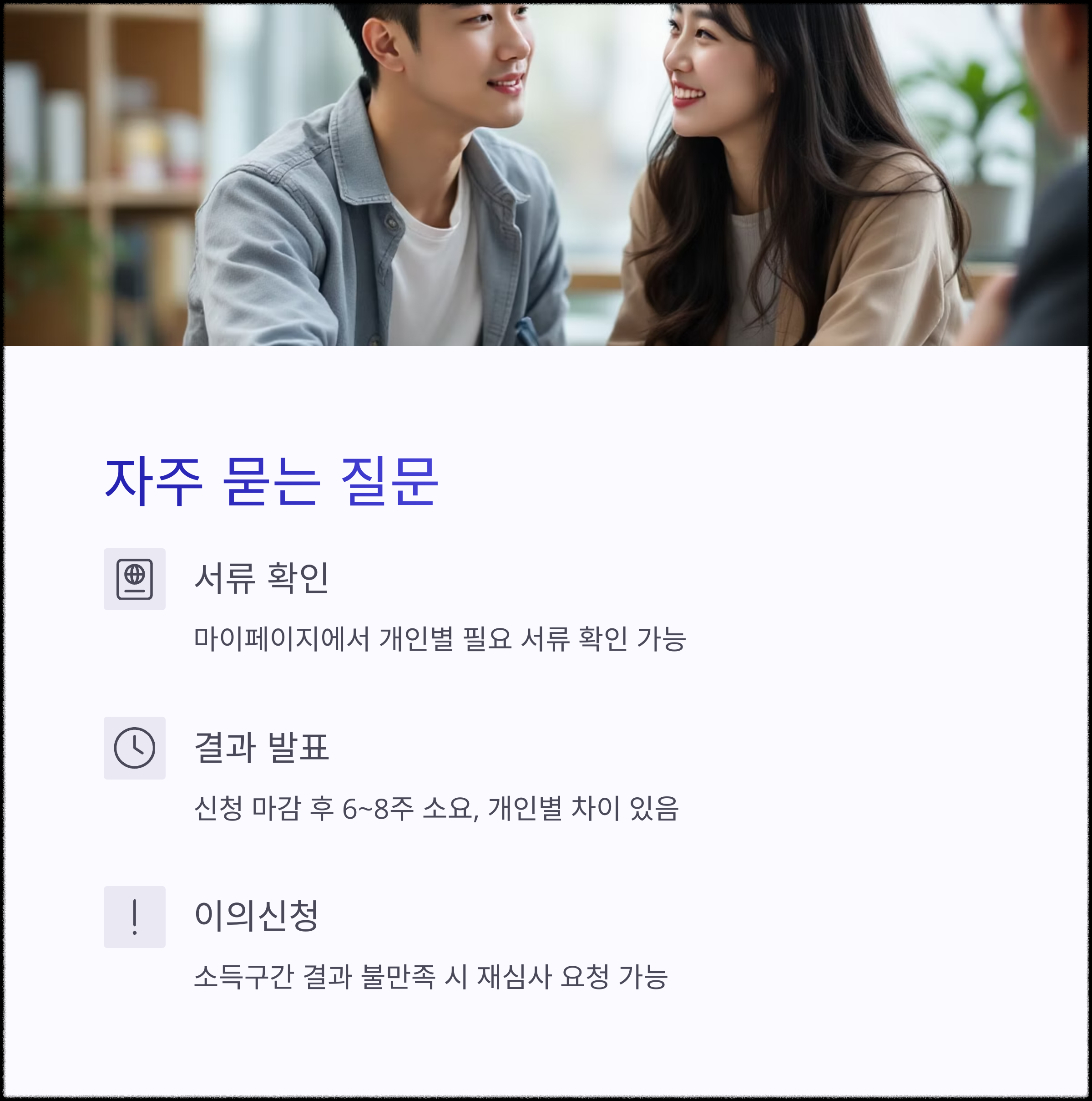 소득구간 산정 결과가 예상과 다를 경우에는 이의신청 절차를 통해 재심사를 요청할 수 있습니다. 이의신청 방법과 절차는 결과 발표와 함께 상세히 안내되므로, 필요한 경우 적극적으로 활용하시기 바랍니다.