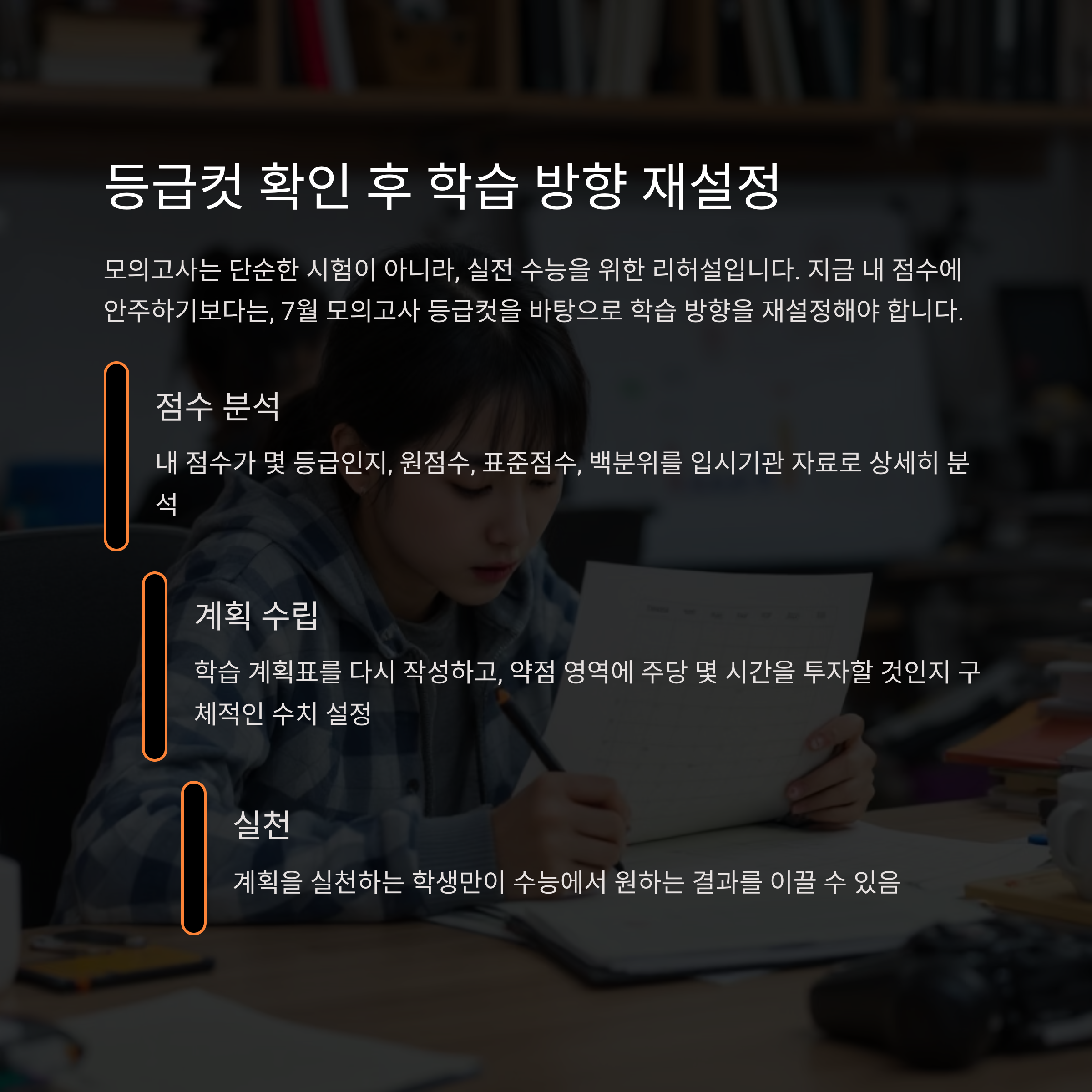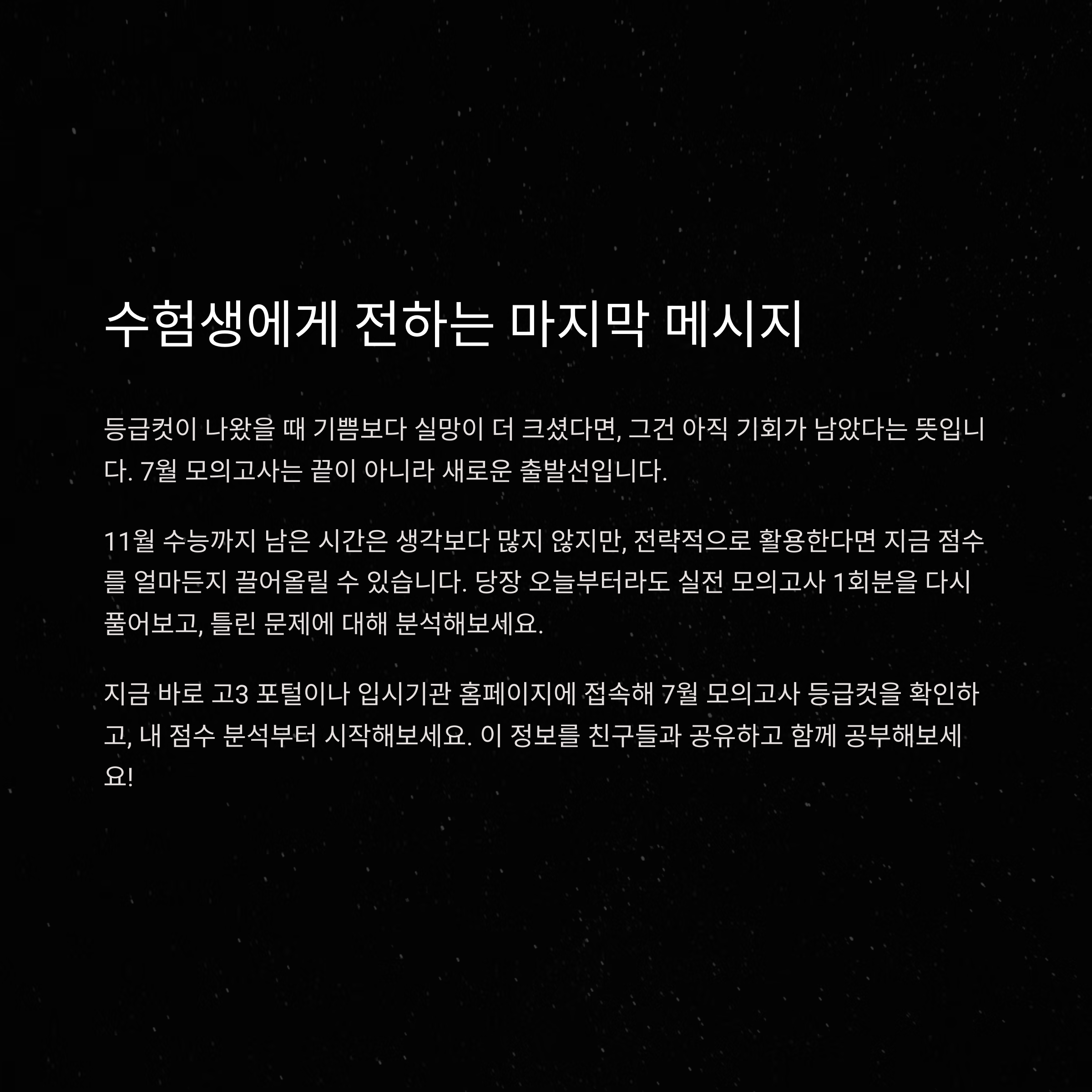 지금 바로 고3 포털이나 입시기관 홈페이지에 접속해 7월 모의고사 등급컷을 확인하고, 내 점수 분석부터 시작해보세요.