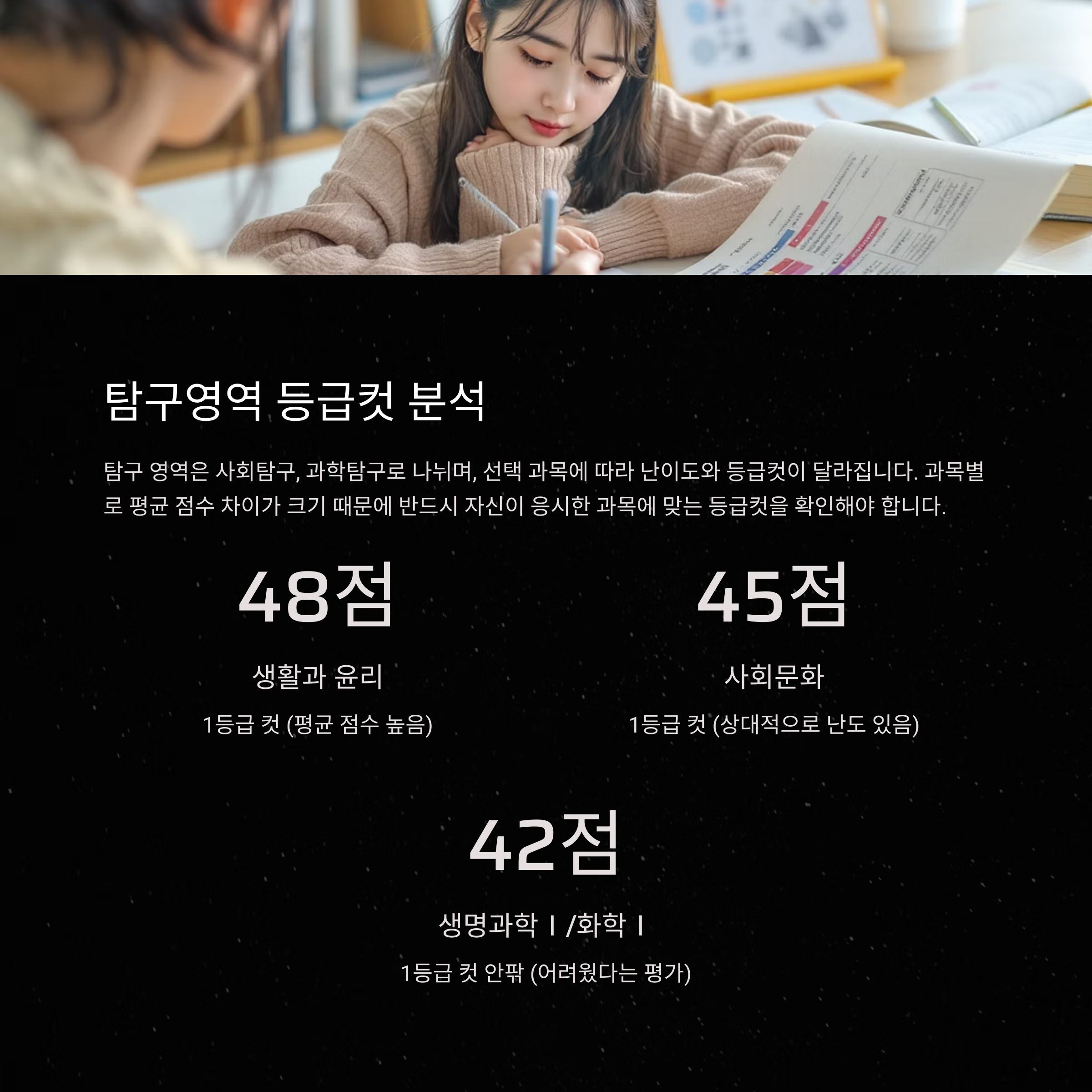 탐구 영역은 사회탐구, 과학탐구로 나뉘며, 선택 과목에 따라 난이도와 등급컷이 달라집니다. 과목별로 평균 점수 차이가 크기 때문에 반드시 자신이 응시한 과목에 맞는 등급컷을 확인해야 합니다.