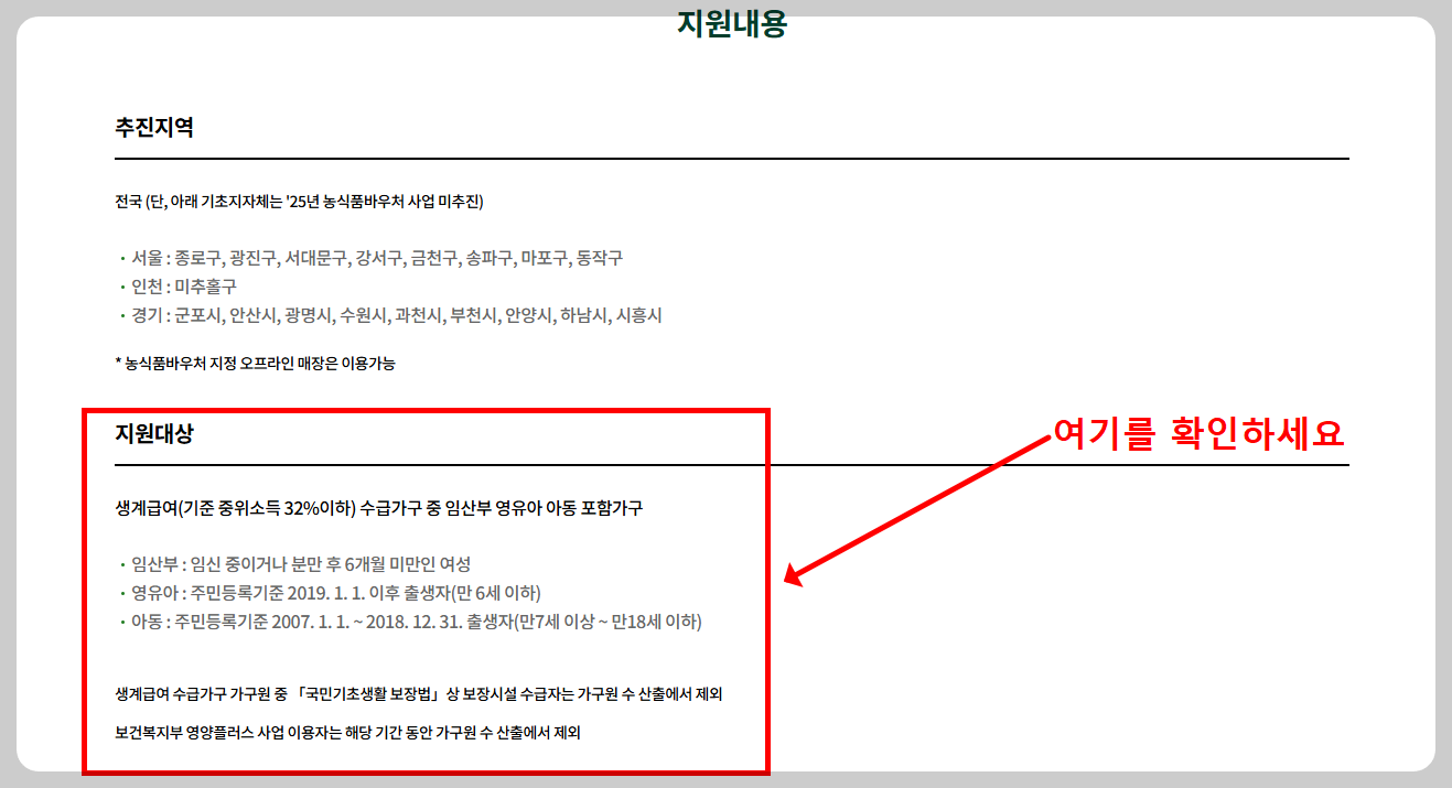 농식품바우처는 생계급여 수급가구 중 중위소득 32% 이하 가구를 기본으로 하며, 임산부와 영유아·아동이 있는 가정은 포함 대상이 된다. 지원 자격의 기준은 다음과 같다. 임산부는 임신 중이거나 분만 후 6개월 이내 여성 영유아는 2019년 1월 1일 이후 출생자 아동은 2007년 1월 1일~2018년 12월 31일 사이 출생자