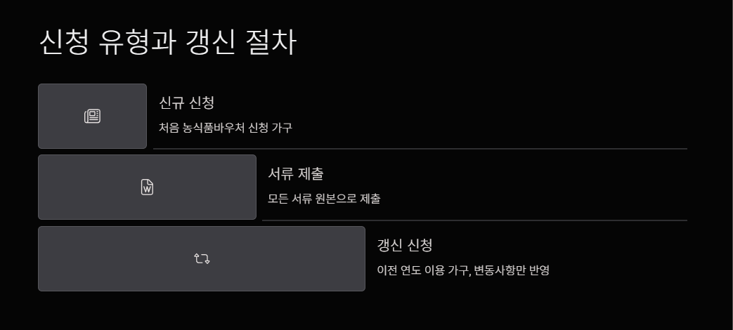 신청 유형은 신규 신청과 갱신 신청으로 나뉜다. 신규 신청자는 처음 농식품바우처를 신청하는 가구이며, 갱신 대상자는 이전 연도에 이용했던 가구가 해당된다. 신규 신청자는 반드시 모든 서류를 원본으로 제출해야 하며, 갱신 신청은 변동사항만 반영하면 된다. 수급 조건 변경 시에는 신규 신청 절차를 다시 밟아야 한다.