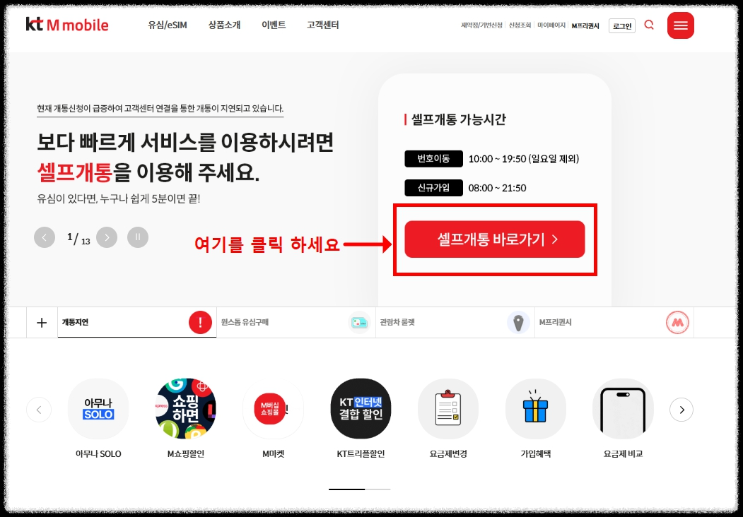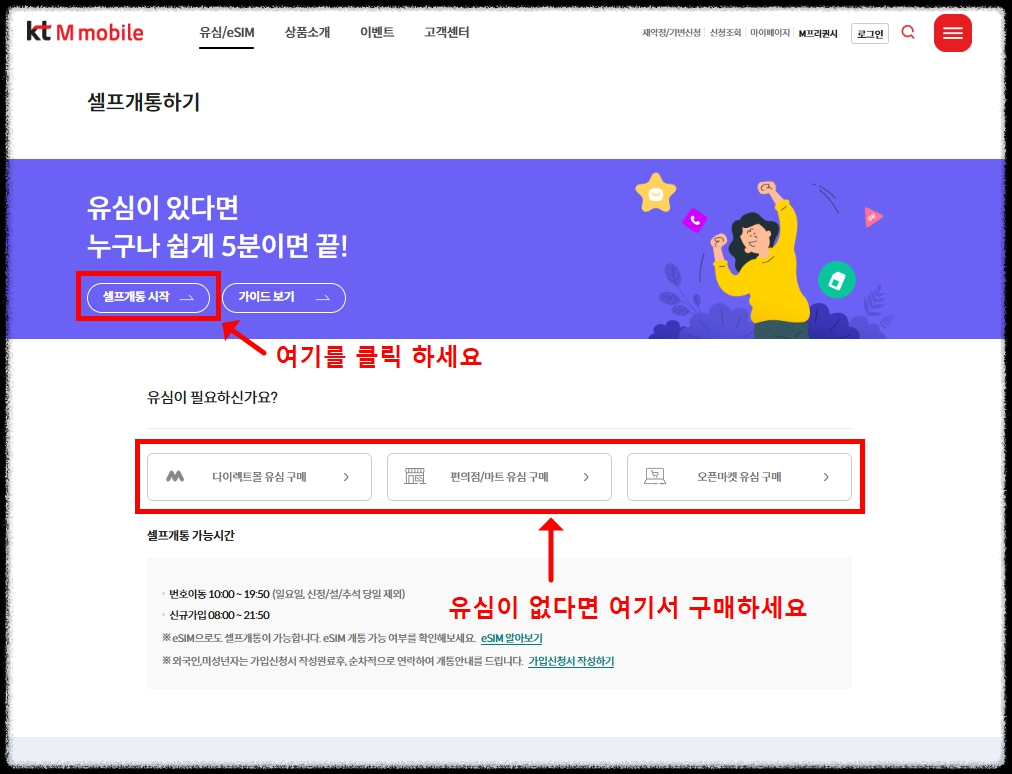 - "셀프개통" 메뉴 선택